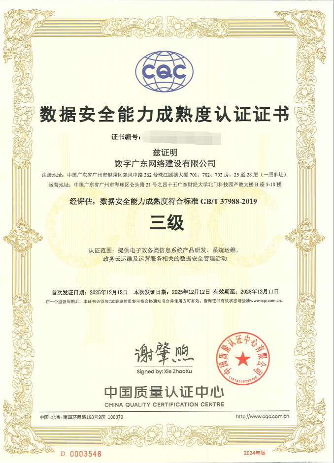 该能力评估体系共分为五个等级,从低到高依次为一级至五级,其中三级认证代表组织数据安全管理已迈入规范化、体系化的成熟阶段。数字广东公司获得三级认证,标志着公司在数据安全战略规划、制度体系建设、技术防护能力、人员专业素养等方面均达到行业先进水平。目前,公司核心业务的数据安全管控流程清晰规范、安全运营机制成熟稳定,能够为数字政府建设、人工智能应用、政务数据共享等关键业务场景提供全流程、高可靠的数据安全保障。