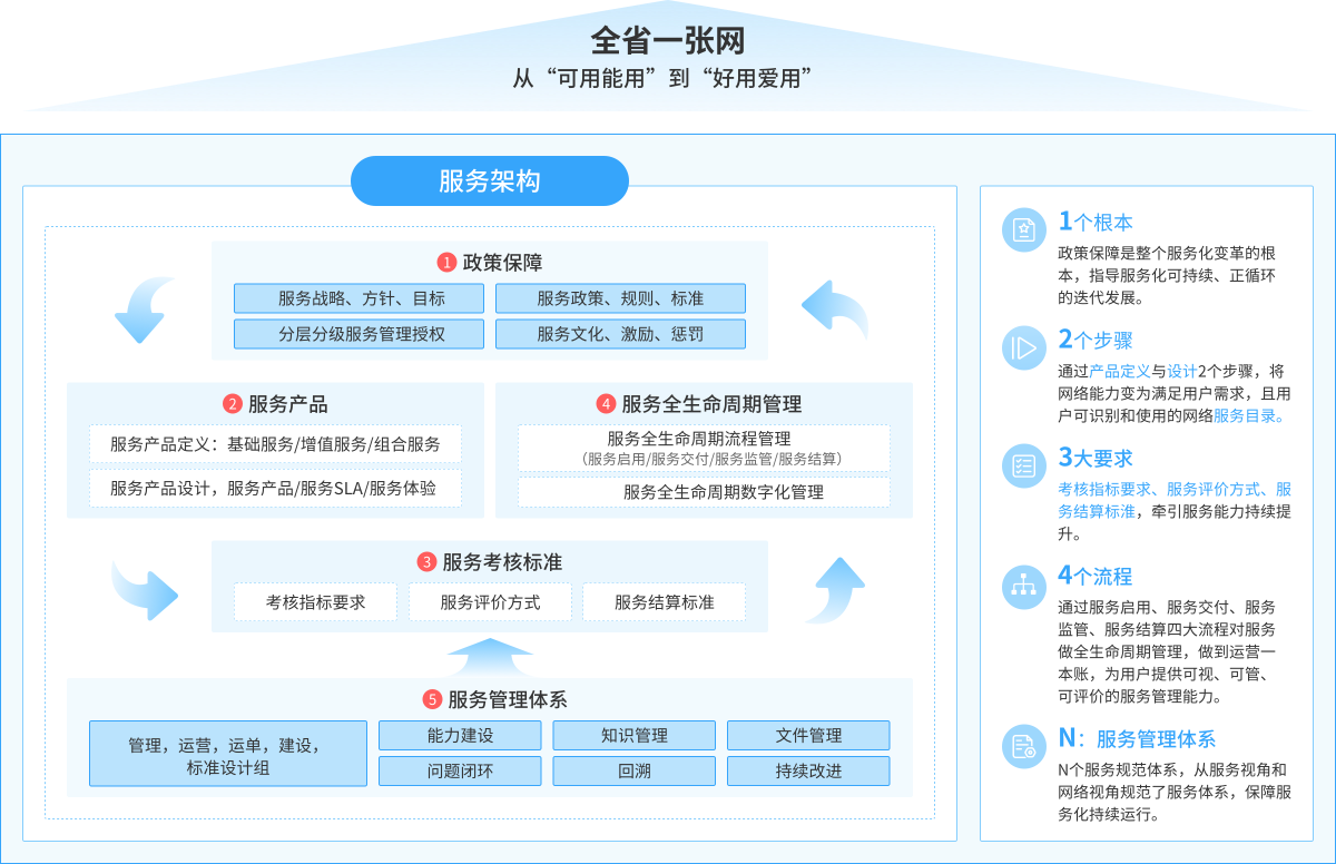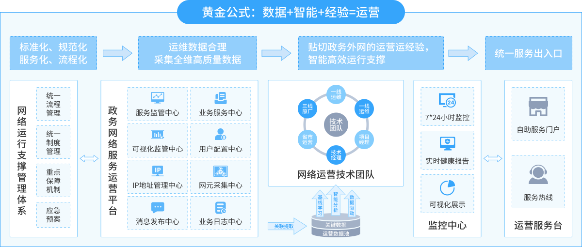 网络运营服务 根据当地业务需求和场景,构建运营运维保障体系,梳理业务流转流程,从技术、规范、资源、质量等方面管理整个网络,做到网络运营“一本账”。